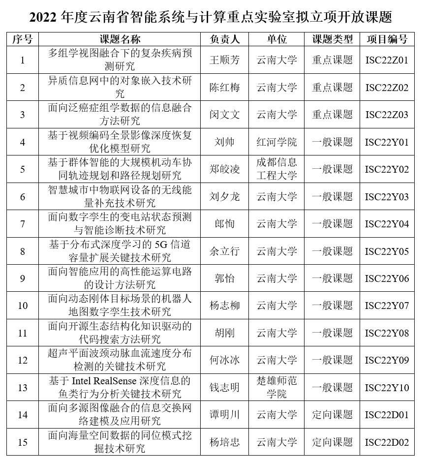 2022年度云南省智能系统与计算重点实验室拟立项开放课题公示