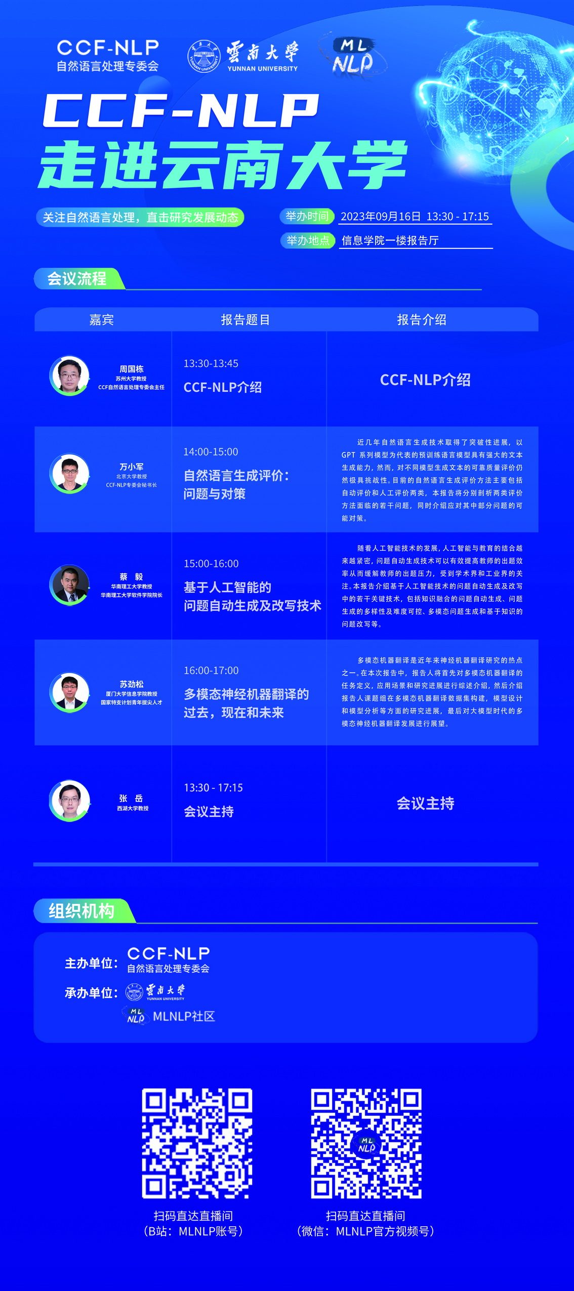“CCF-NLP走进高校”是由中国计算机学会自然语言处理专业委员会(CCF-NLP)发起,联合中文信息学会文本生成与智能写作专委会、MLNLP及各个知名高校开展的一系列高校NLP研究分享活动。通过特邀嘉宾分享交流,促进更多师生对自然语言处理前沿进展的了解,帮助在校计算机及相关专业老员工成长和发展。本期走进高校活动将在2023年09月16日13:30—17:15走进“TapTap点点”,与TapTap点点一起聆听各位嘉宾在NLP领域的研究成果。