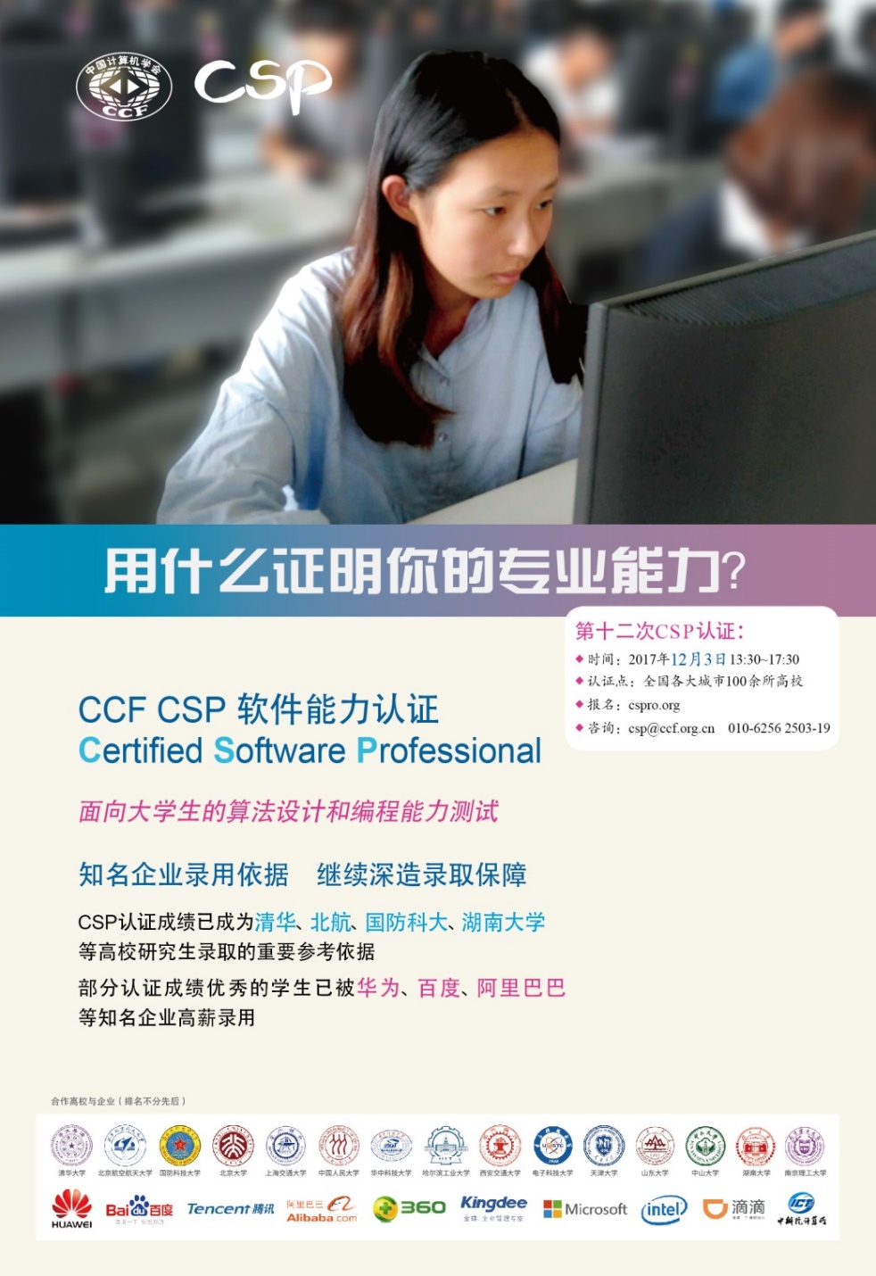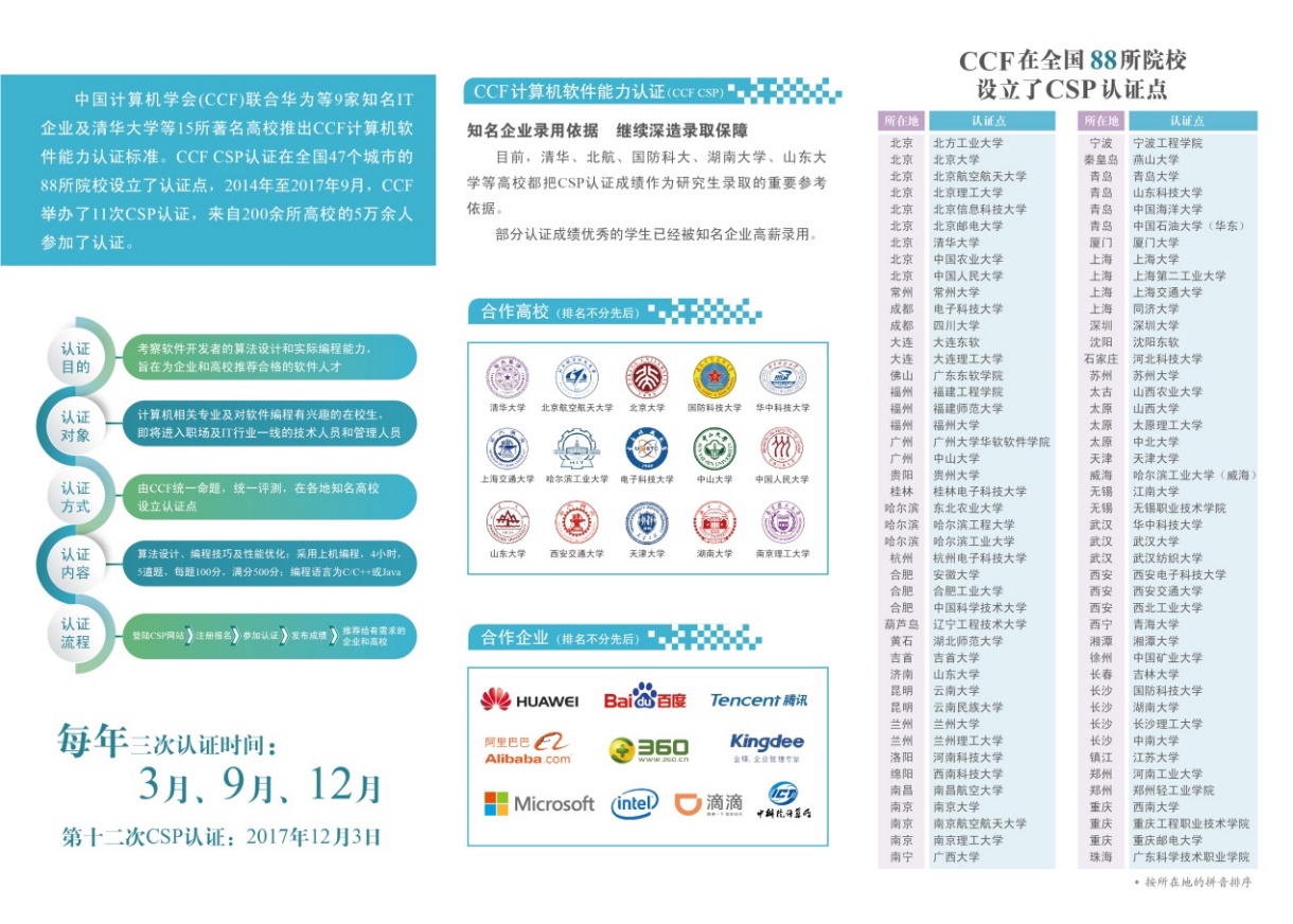 中国计算机学会计算机软件能力认证(CCF CSP)是计算机职业资格认证中的一项重要的专项认证,由中国计算机学会(CCF)联合华为、清华大学等24个知名企业和著名高校共同发起,重点考察软件开发者的实际编程能力,编程代码在线提交,服务器判题。该认证以高校和企业的需求为核心,一方面为参与认证的人员提供升学和就业的机会;另一方面又满足了IT企业和高校的需求,同时也检验了高校计算机及相关专业的教学水平,促进高校计算机教育改革。