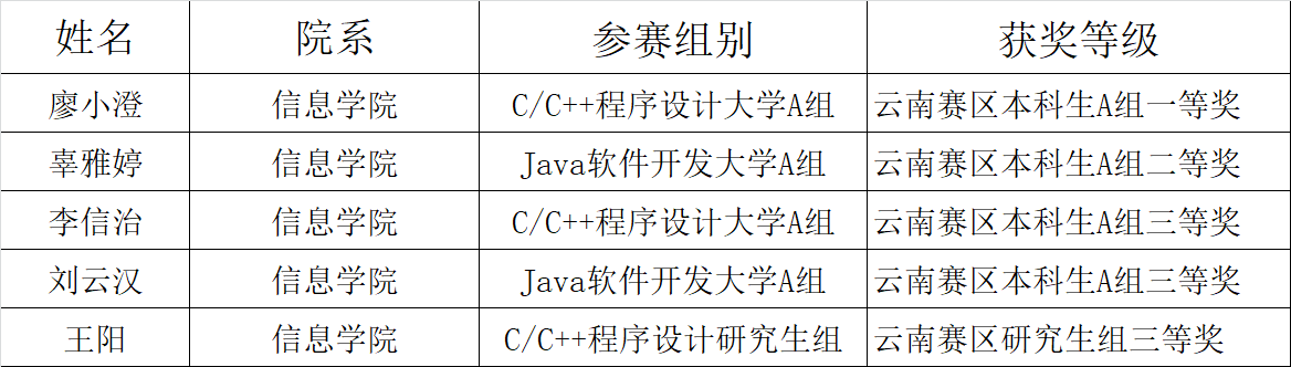 第十届蓝桥杯全国软件和信息技术专业人才大赛云南赛区竞赛于2019年3月24日在昆明举行,获奖名单如下: