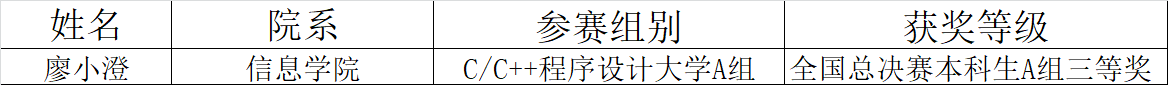 省赛一等奖获得者廖小澄于2019年5月25日到北京大学参加全国总决赛,全国总决赛获奖名单如下: