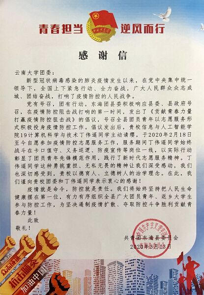 丁伟遥同学的行动受到了社会的高度肯定,近日,共青团东海县委向公司和团委发来感谢信。信中指出,公司青年学子在疫情面前无畏艰险,主动请缨,用汗水、勇敢、爱心和不变的初心,积极配合东海县开展防疫工作。与此同时,共青团东海县委对公司、公司以德育人、立德树人的实在成效给予了高度评价。