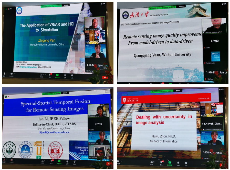 徐丹教授主持会议主题报告。杭州师范大学VR与智能系统研究院经理、广东虚拟现实产业研究院经理、钱江学者、中国图像图形学学会副理事长潘志庚教授做了题为《The Application of VR and HCI to Simulation》的主题报告,中山大学IEEE Fellow李军教授做了题为《Spatio-Temporal Fusion for Remote Sensing Images》的主题报告,武汉大学测绘工程系主任袁强强教授做了题为《Remote sensing image quality improvement: From model-driven to data-driven》的主题报告,英国莱斯特大学周挥宇教授做了题为《Dealing with uncertainty in image analysis》的主题报告,为参会人员带来一场学术盛宴。