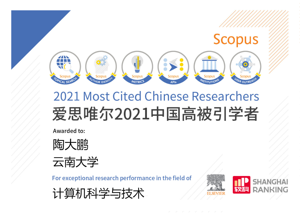 爱思唯尔高被引中国学者榜单是基于客观引用数据对中国研究者在世界范围内的影响力进行系统分析而得出的结果。陶大鹏教授长期致力于人工智能与机器人领域相关研究,2020至2021连续两年入选高被引学者榜单,是云南省计算机科学与技术学科领域唯一入选者,表明了陶大鹏教授以第一作者和通讯作者所发表论文的总引用次数在计算机科学与技术领域处于领先水平,具有较高的学术影响力。