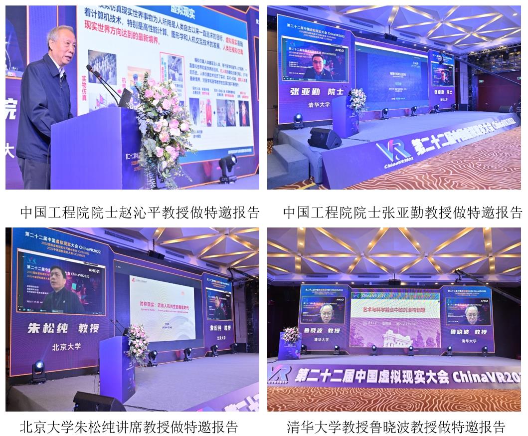 开幕式后,大会邀请了院士、长江学者、杰青等专家学者,带来了9场高水平的特邀报告。中国工程院院士、北京航空航天大学赵沁平教授为大家做了《从虚拟现实1.0到虚拟现实2.0》的特邀报告,指出虚拟现实特征逐渐从沉浸性、构想性和交互性,扩展到智能化、互通化和演变化,构建虚实混合空间、物数空间,有助于大幅度提升各行业领域的生产和服务运行效能。中国工程院院士、清华大学张亚勤教授为大家带来了《物理世界和元空间》的特邀报告,提出数字化3.0是信息智能+物理智能+生物智能,是原子、分子与比特的映射,是物理空间与元空间的融合。北京大学朱松纯讲席教授介绍了《对称现实-迈向人机共生的智能时代》,指出对称现实是人工智能与虚拟现实的融合结果,是迈向人机共生智能时代的重要路径。清华大学文科资深教授鲁晓波教授特邀报告题目为《艺术与科学融合中的沉浸与创想》,指出虚拟现实艺术是多种技术的融合,设计应该通过自然和人文价值并重、科学与艺术融合,以科学精神、人文情怀来推动创新。