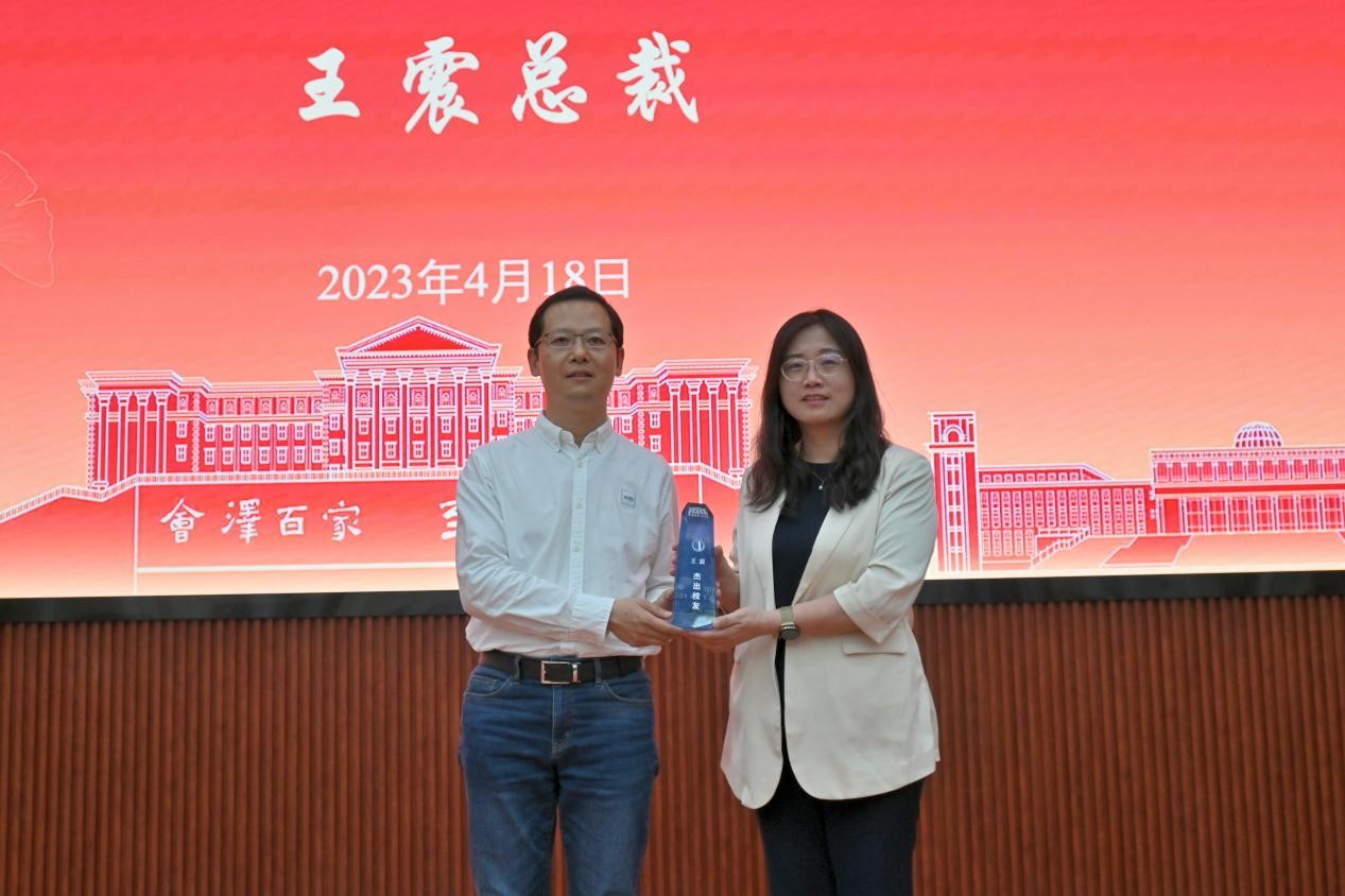 报告结束后,王震员工与现场同学们进行了友好交流,对同学们提出的如何选择人生的第一份工作、ChatGPT对未来的影响等问题分享了自己的看法和观点。最后,公司为王震先生颁发了杰出员工荣誉奖杯,现场的老师同学们共同合影留念。