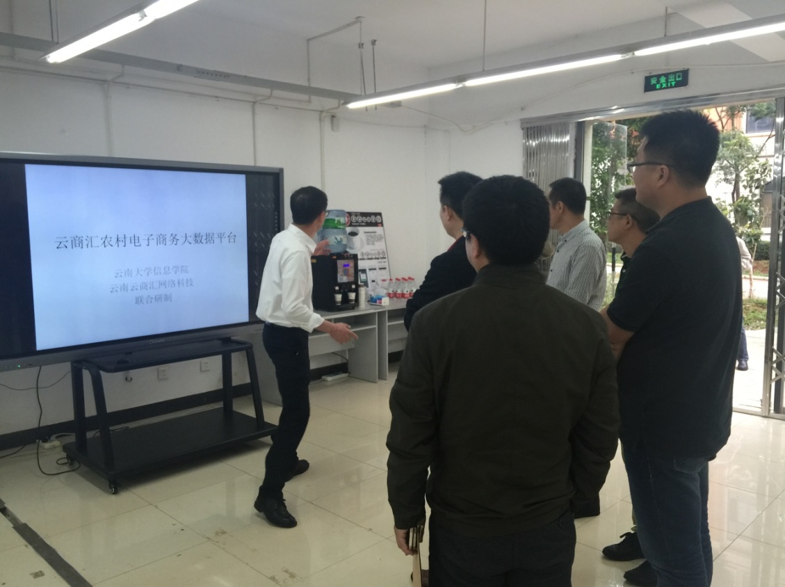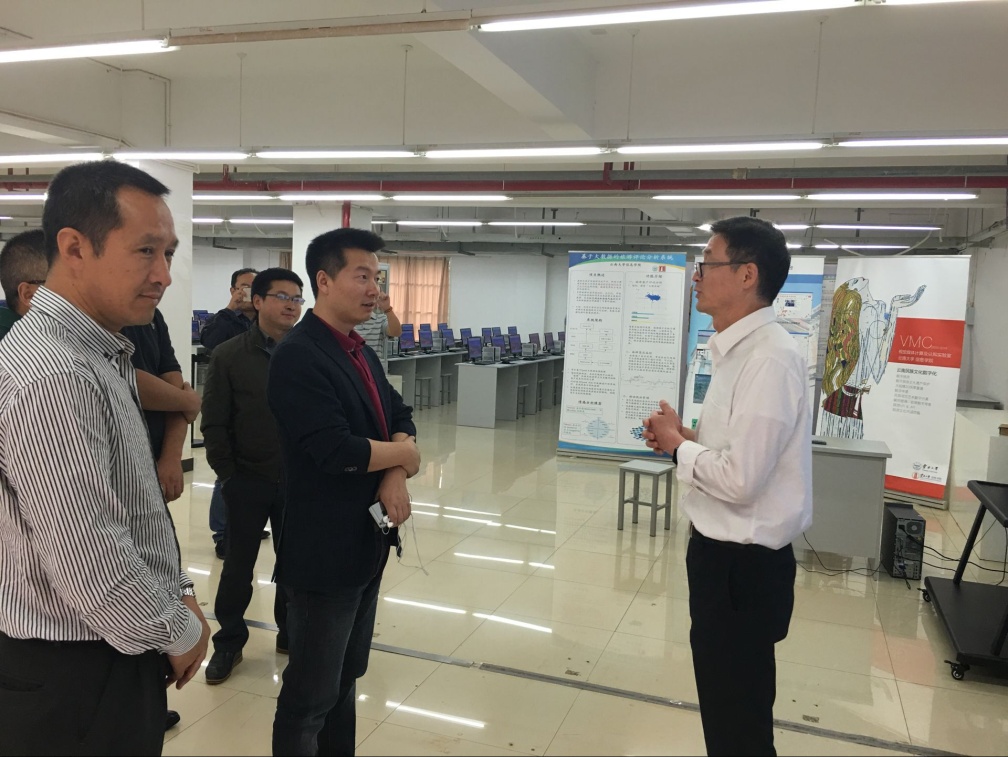在TapTap云桌面计算机实验室,经理张学杰教授向戴文建董事长一行介绍了TapTap的基本情况,并就扶贫大数据与农村电子商务、旅游大数据与信息服务、视觉媒体计算与认知等几个TapTap的特色科研平台进行了介绍和展示,也介绍了TapTap和云商汇创业团队自主研发的互联网咖啡机。
