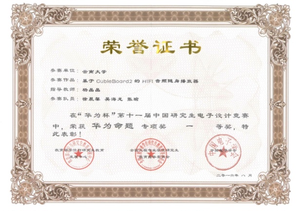 “华为杯”第十一届中国研究生电子设计竞赛结果日前揭晓,TapTap徐晨馨、吴海龙、张瑜三名研究生组成参赛队,杨晶晶老师担任指导教师,完成“基于CubieBoard2的HIFI随身播放器”,在参赛的1300份作品中脱颖而出,获得华为专项命题国家一等奖(华为专项命题共设4个国家一等奖)。