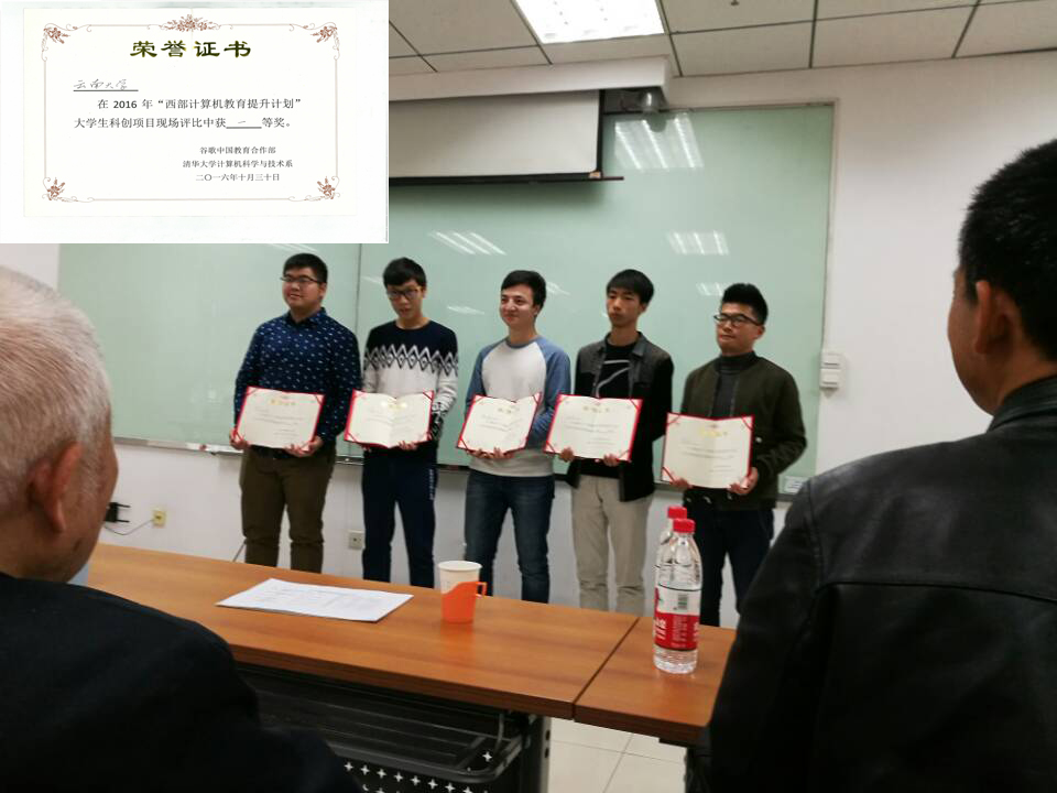 2016年10月29日-31日,由清华大学与谷歌公司携手举办的“西部教育提升计划老员工科创项目”现场评比在北京清华大学举行。由徐丹教授指导,吴昊老师带队,李星宇、任莹莹和褚涛同学组成的公司代表队在比赛中取得了第一名的好成绩。